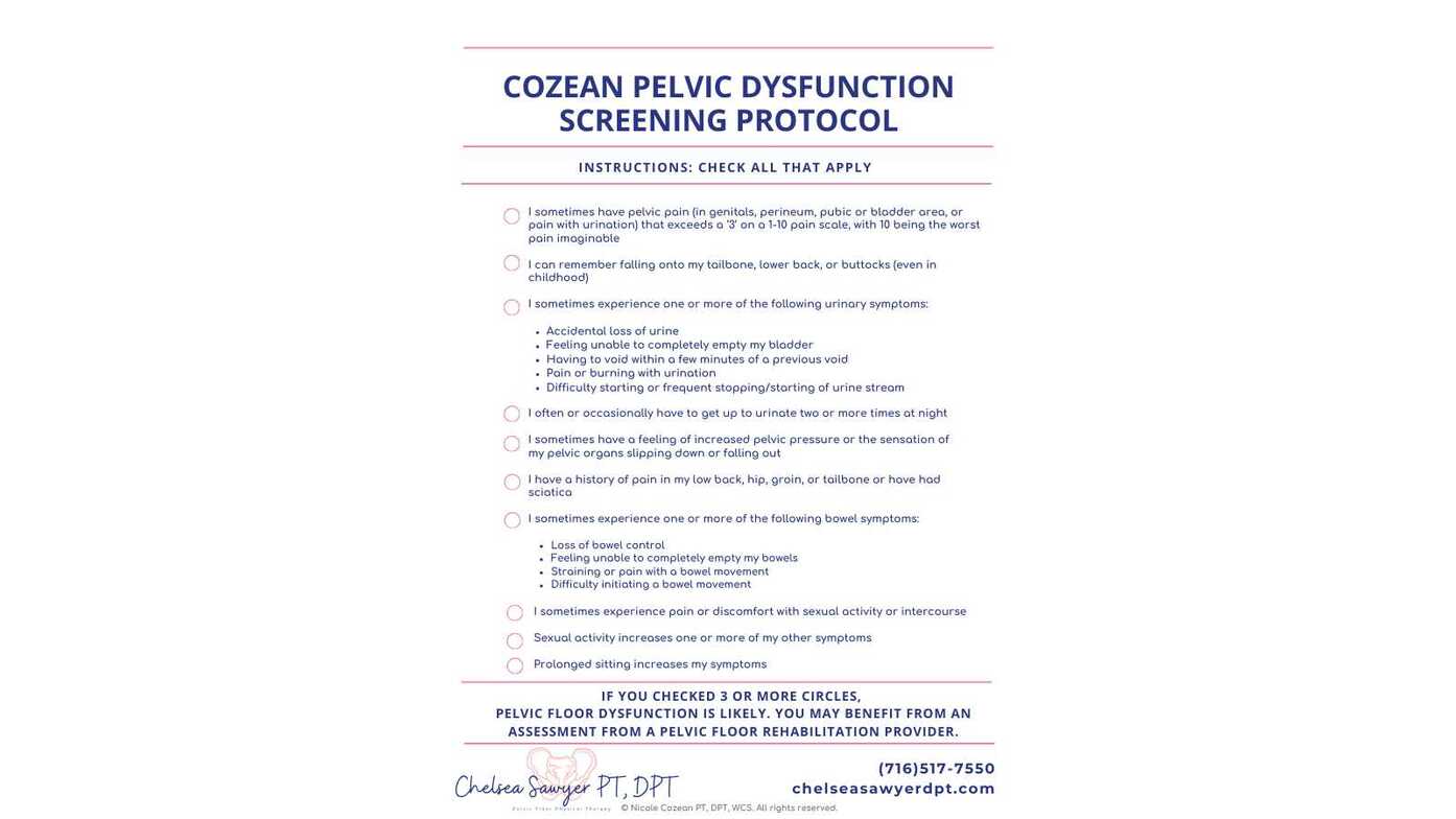 Pelvic floor dysfunction affects millions of individuals worldwide, yet it remains a topic shrouded in silence and misunderstanding. From pelvic pain to urinary incontinence, these conditions can have a profound impact on one's physical and emotional well-being. Fortunately, pelvic floor therapy offers effective solutions for managing and treating pelvic floor dysfunction. To help individuals determine if they could benefit from pelvic floor therapy, Nicole Cozean, a leading pelvic health physical therapist in California, has developed a groundbreaking screening tool. Listed below are ten questions listed on the Cozean Pelvic Dysfunction Screening Protocol. If you answer YES to three or more statements, it is likely that you are experiencing pelvic floor dysfunction.